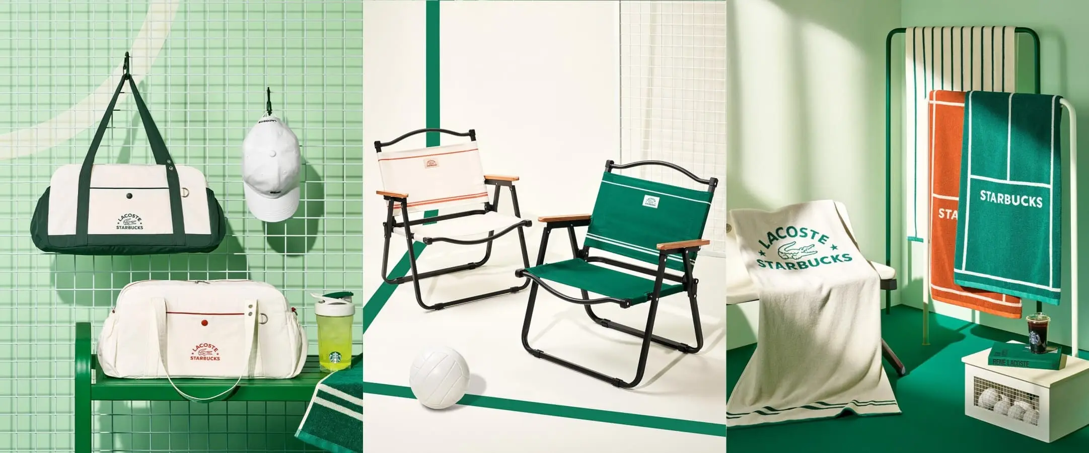 - 와이드 폴딩 체어 – 편안한 휴식을 위한 넉넉한 사이즈의 접이식 체어. 라코스테 로고와 스타벅스 그린 컬러 포인트가 인상적입니다.